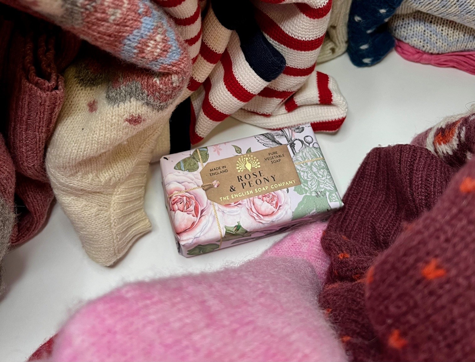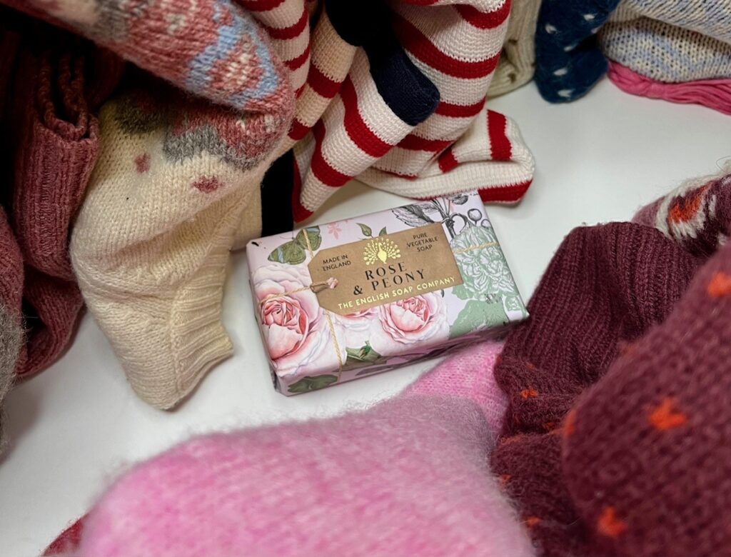 Innan jul köpte jag en fin tvål som jag skulle ge bort i julklapp. För att mottagaren inte skulle hitta den gömde jag den i en byrålåda bland mina stickade tröjor. Sen glömde jag såklart bort tvålen. Häromdagen när jag letade fram en stickad tröja jag inte använt på länge så luktade den så gott! Jag tänkte Men oj, hur kan den lukta så gott?! Då ser jag den glömda tvålen ligga där bland tröjorna och inser att den har luktat av sig så på alla tröjor!
