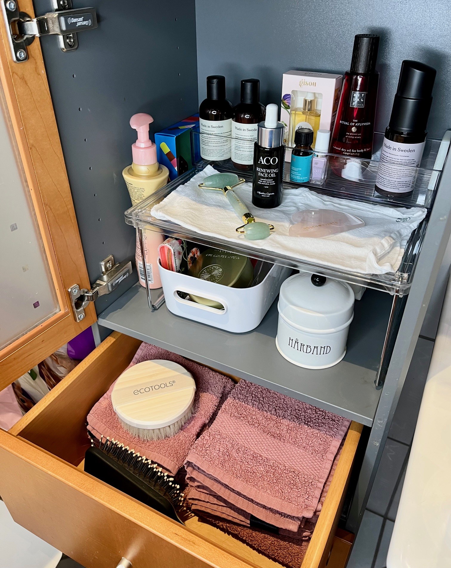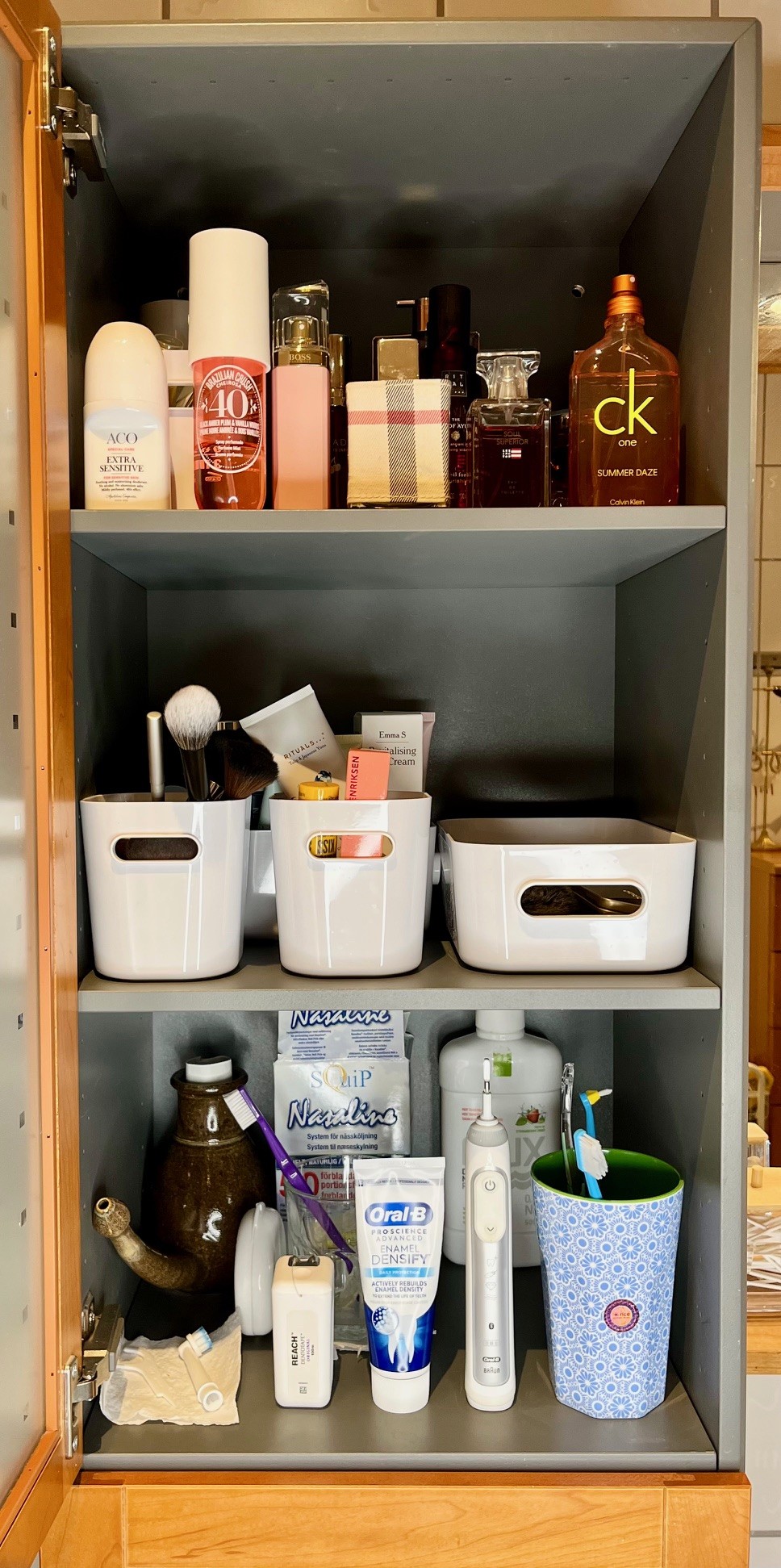 Från listan med de 12 punkterna som jag ska organisera under 2026 så valde jag att satsa på badrumsskåpet i februari. (Det har varit lång handläggningstid på detta inlägg, därav den sena rapporteringen!) Av de 12 punkterna upplevde jag badrumsskåpet som mest akut just nu. Jag kunde knappt öppna skåpet utan att bli attackerad av en gammal parfymflaska eller ett torrschampo som trillade ner i huvudet på mig. Ingen bra start på dagen!